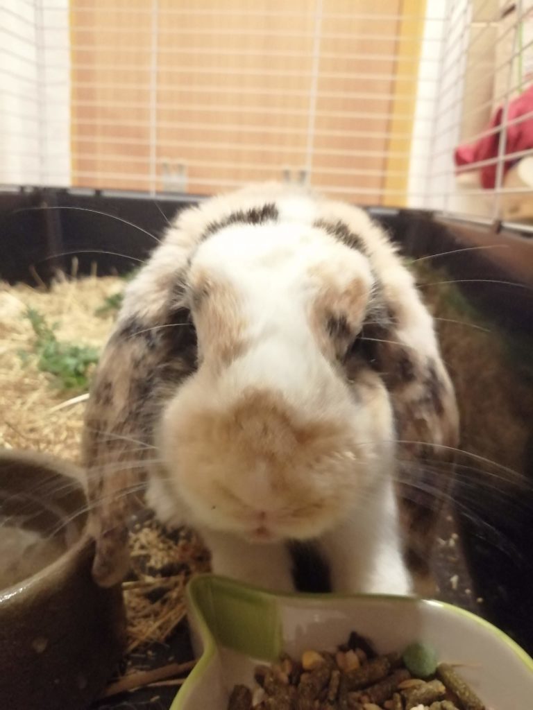 Bartoloměj, tak mu říkáme, je u nás v depozitu. Ze svého obydlí sleduje veškerý pohyb a číhá na nějakou dobrotu. Přestože nejde o úplně nejmladší kousek, kondici má skvělou a apetit výtečný. Jako správnému králíkovi mu nechybí zvědavost, drzost a optimistický pohled na svět.